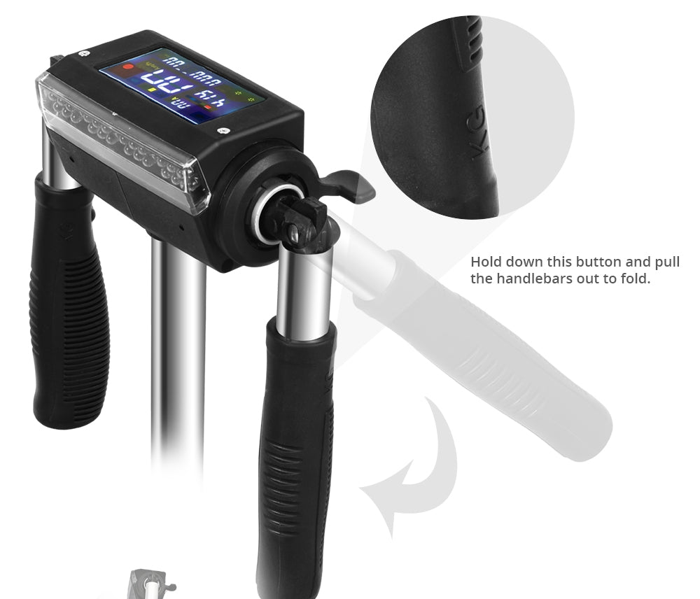 - Adjustable handlebar height - 3 heights to adjust to 930mm, 1070mm, and 1160mm. Handlebars also fold flat for easy storage and transport!