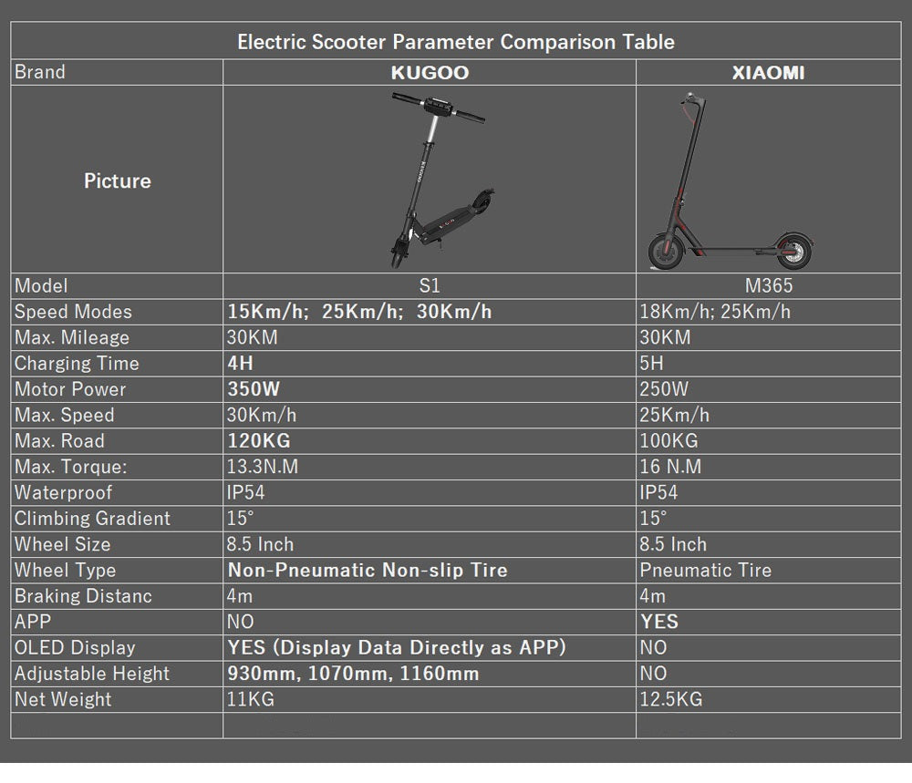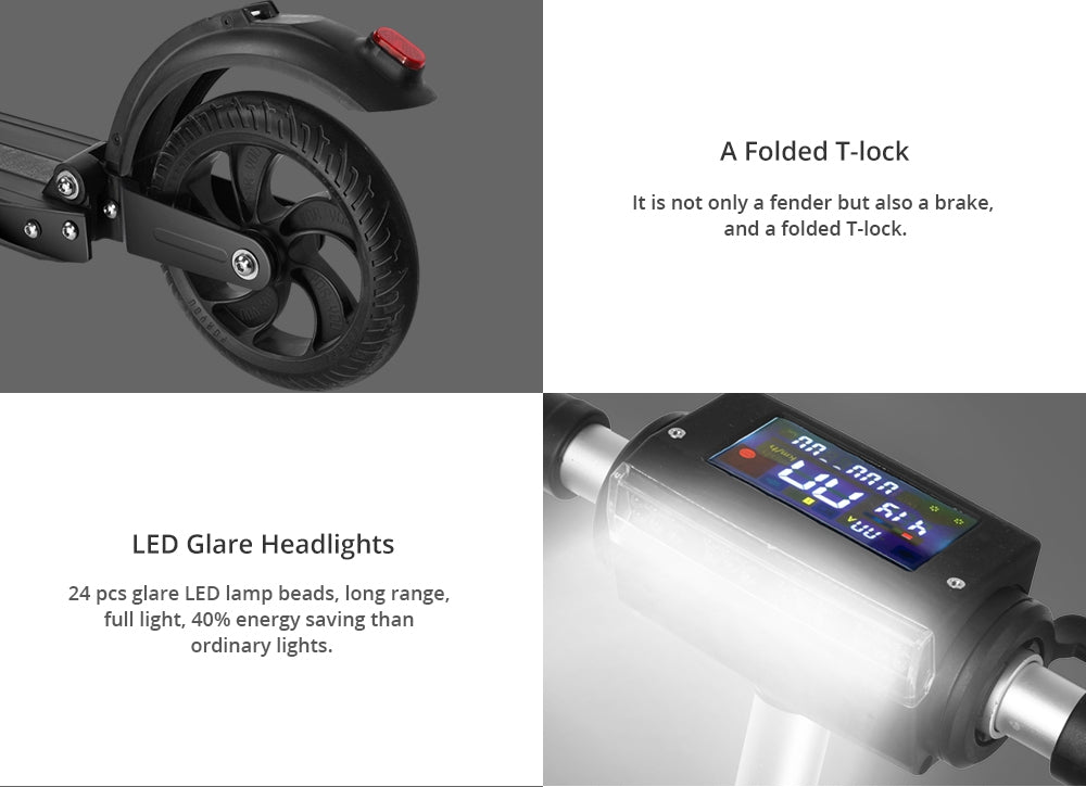 KUGOO S1 has all of the features you expect for a top of the line electric scooter, handlebar control system display, thick durable tyres, front and rear lights hand braking system and a rear brake for increased safety