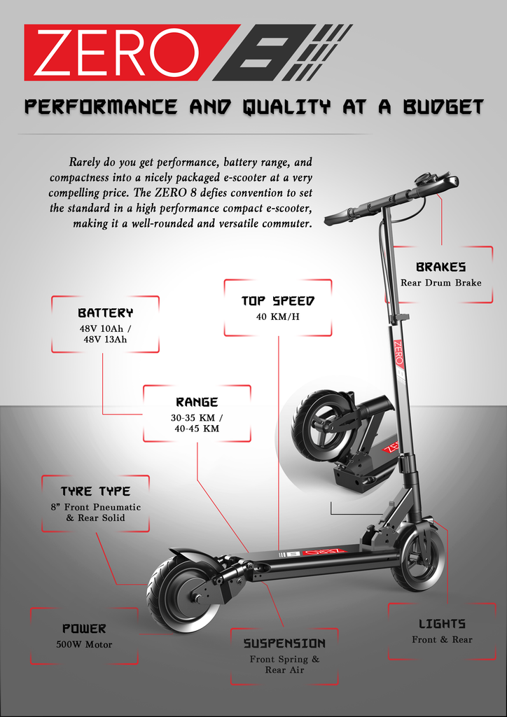 Rarely do you get performance, battery range and compactness into a nicely packaged e-scooter, but the ZERO 8 defies convention to set the standard in high performance compact e-scooters.